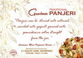 - Grandma’s Traditional Panjeri is an exquisite snack brimming with energy, offering highly nutritious treats for the entire family, crafted from 100% Natural ingredients including Almonds, Cashew Nuts, Dry Figs, Pistachios, Walnuts, Raisins, Dry Dates, Lotus Seeds, Dry Coconut, Kangi ke Beej, Watermelon seeds, Sugar, Pure Ghee, Pine Nuts (Chilguza), and Premium Quality Tirrmen Edible Gum.