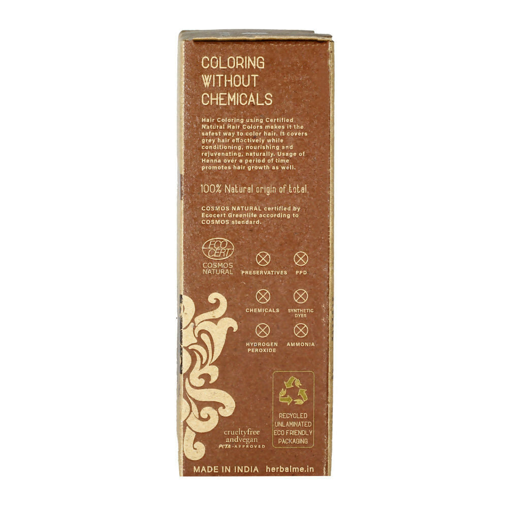 - Herbal Me Organic Henna Hair Color is crafted from ingredients sourced from certified organic farms, ensuring that each component is of premium quality, safe for hair, and entirely natural. Rather than relying on chemical dyes that may harm your hair over time, choose Herbal Me Organic Dark Brown Hair Color, which is not only completely safe but also offers natural benefits. This product's credibility is reinforced by international certifications, including those from Ecocert Greenlife (France), PETA India, and Halal. First-time users of Herbal Me Dark Brown Henna might not achieve their desired shade initially if their hair has been previously treated with chemicals or dyed. In such cases, the color may need to be applied 3-4 times or more, depending on the hair's condition. However, as the hair begins to repair and is nurtured by the gifts of nature, the result is long-lasting and free from side effects.