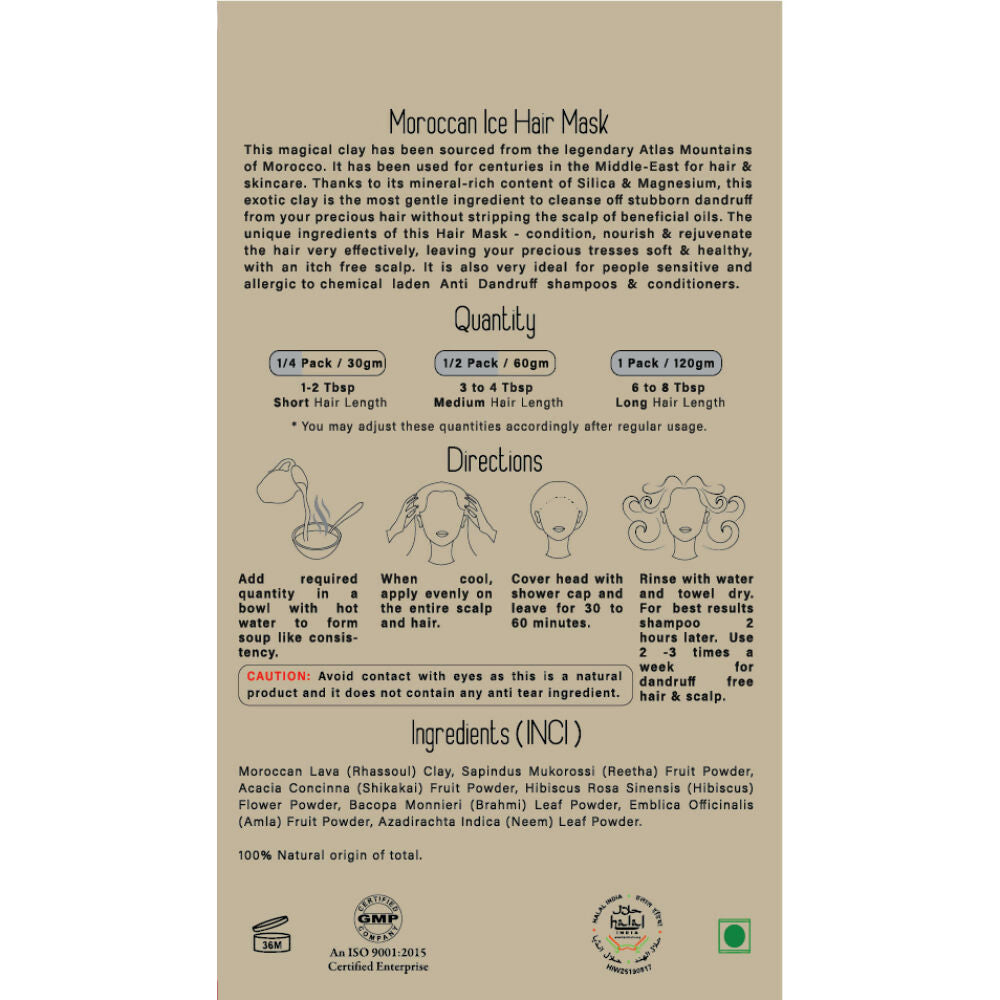 - Herbal Me Moroccan Ice Hair Mask provides a comprehensive remedy for an itchy scalp. This hair mask is crafted with entirely natural components that effectively remove persistent dandruff from your hair while retaining the scalp's beneficial oils. Composed of Rhassoul clay sourced from Morocco, this mask eliminates impurities from both the hair and scalp. It fortifies scalp tissue and encourages robust hair growth. Consistent use of this product results in a resilient and itch-free scalp.