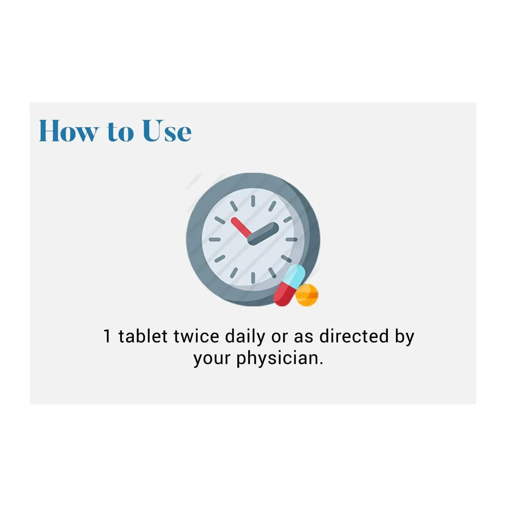 Consume 1-2 tablets twice daily with water, preferably post meals. Consult a professional for the suitable dosage based on your specific requirements.