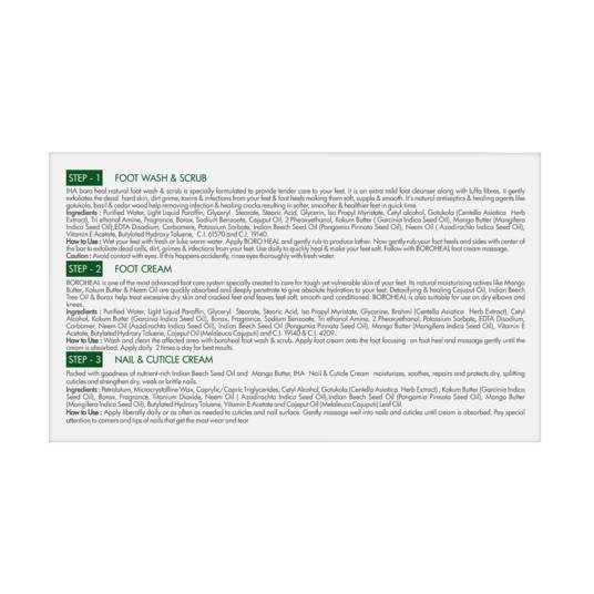 - The Boroheal Foot Spa is an innovative foot care regimen enriched with the most powerful botanicals and active ingredients. This kit includes the Boroheal Foot Scrub, Hydrating Foot Cream, and Nail & Cuticle Balm. Providing a comprehensive solution for maintaining the wellness of your heels and nails, the Boroheal Foot Spa is a must-have for every home to enjoy perpetually happy feet.