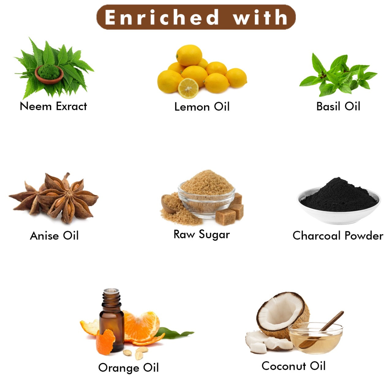 - Neem Extract, Lemon oil, Basil oil, Anise Oil, Orange Oil, Raw Sugar, Charcoal Powder, Coconut oil.
