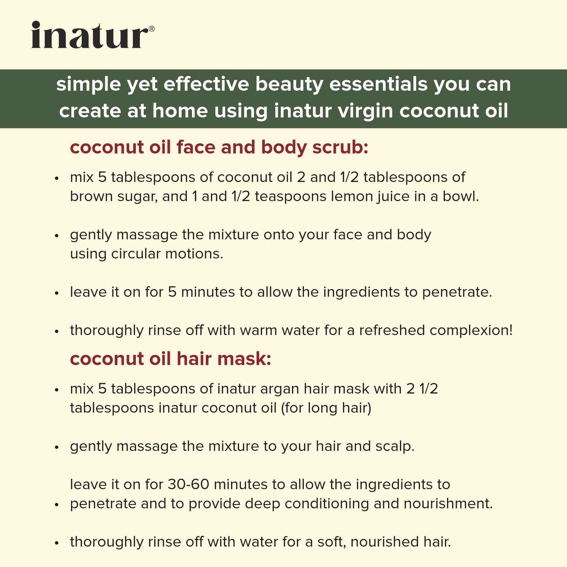 - Gently massage INATUR Coconut oil onto the face, body, or hair after cleansing. Suitable for daily use and can also be applied under the eyes.
