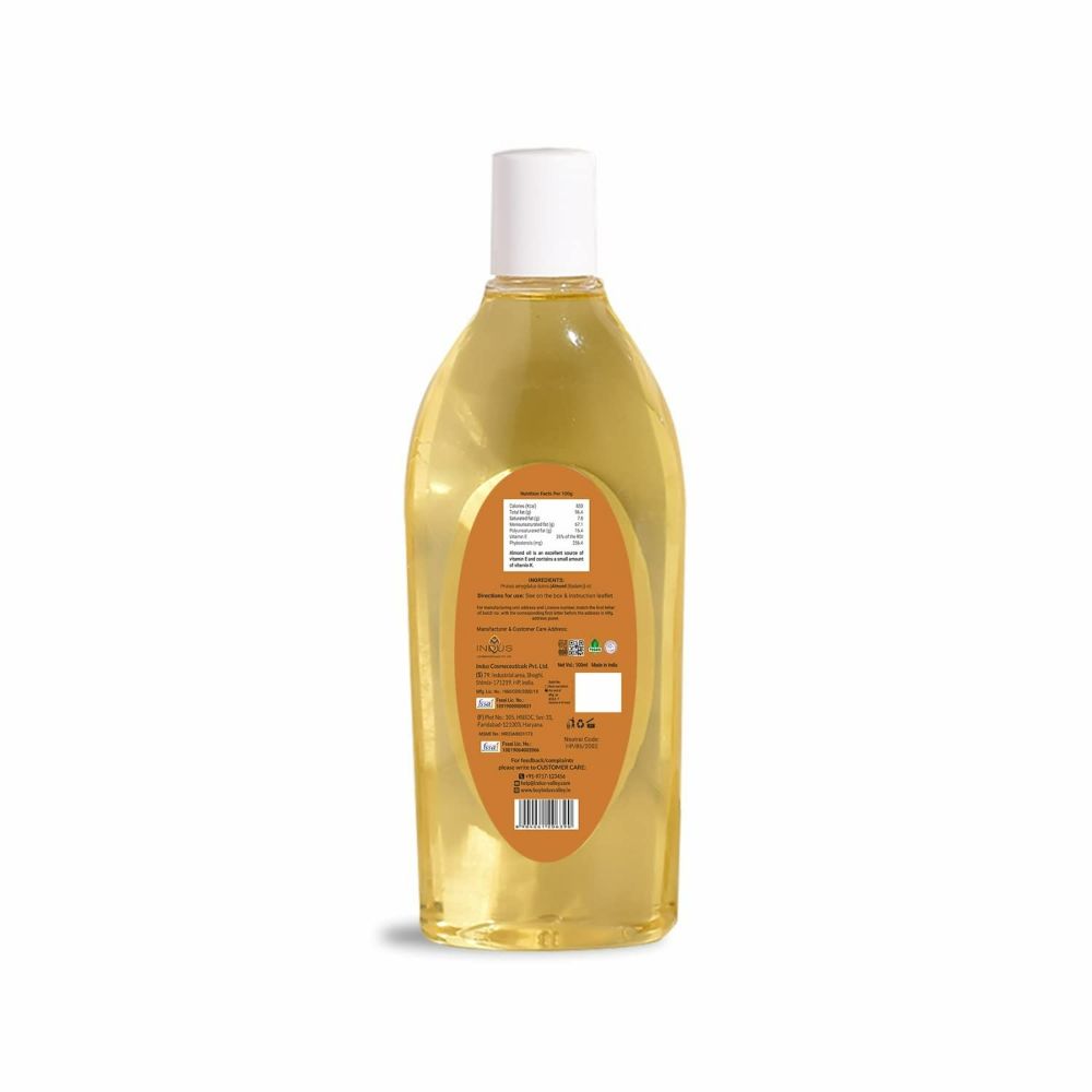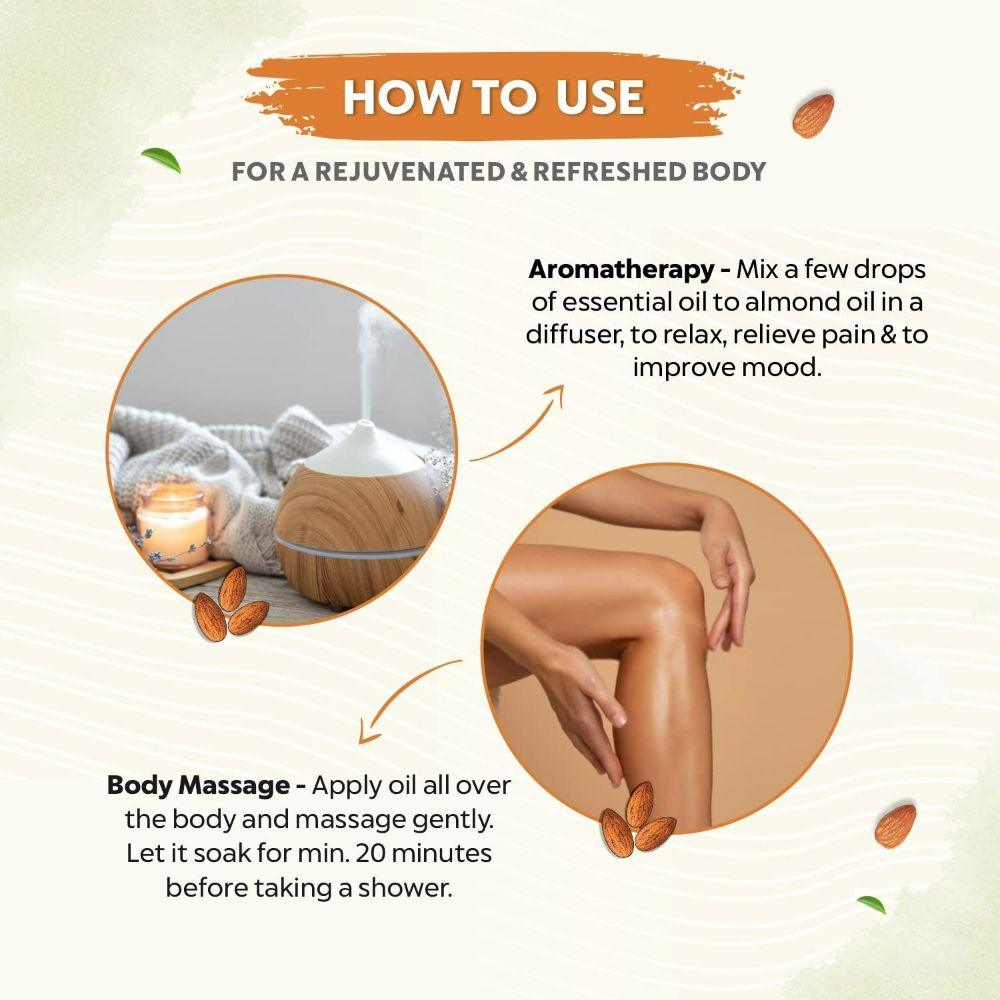 - 100% cold-pressed almond oil suitable for hair and skin.