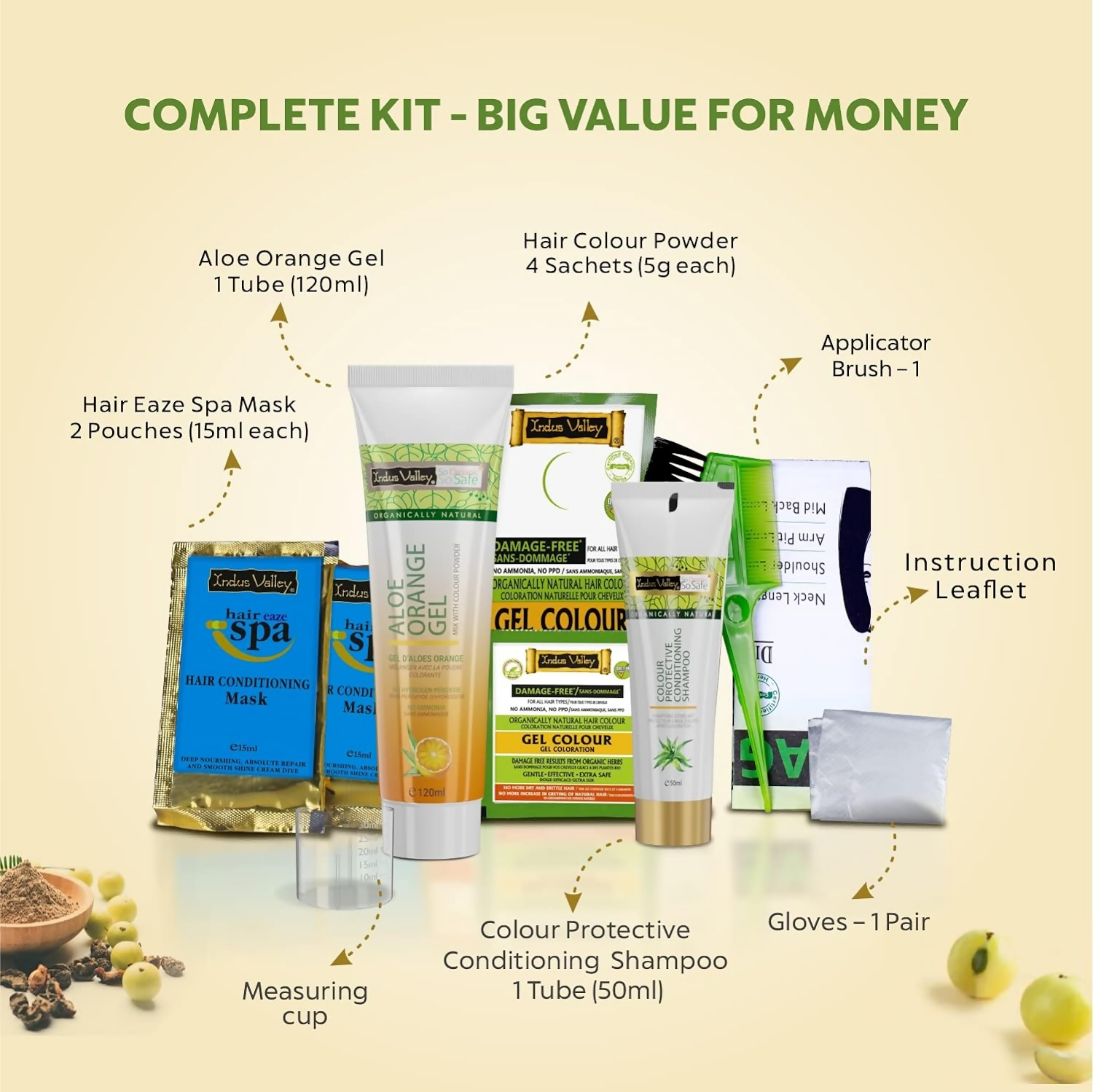 - Orange, Jojoba, Aloe Vera, Basil, Amla, Henna, Sunflower and Wheatgerm