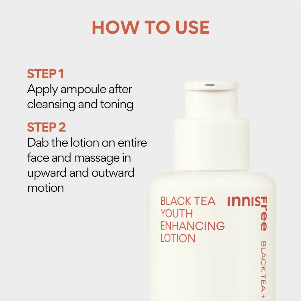 About the product:- Innisfree Black Tea Youth Enhancing Lotion is a luminous lotion crafted with Reset concentrate, designed to improve the firmness and radiance of your skin.