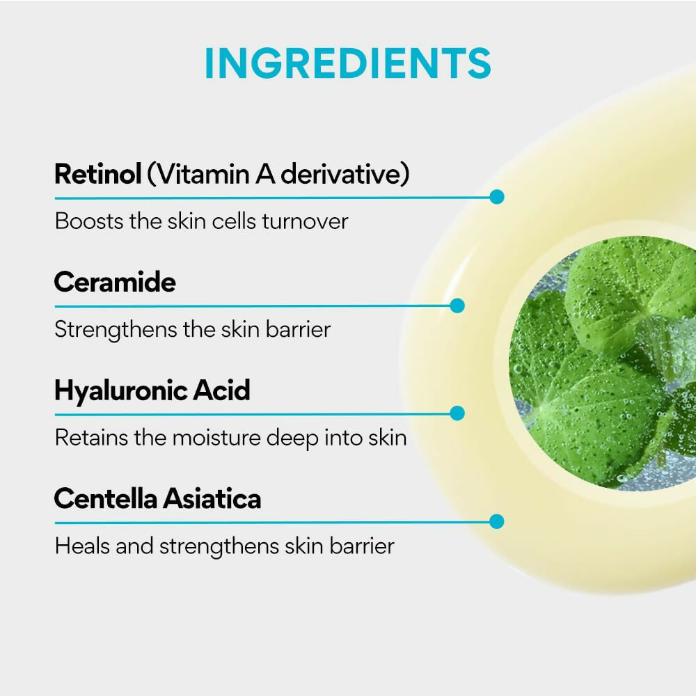 About the product:- This potent hydrating ampoule features Retinol and Cica (derived from Centella Asiatica) ingredients designed to address everything from initial skin concerns like dead skin cells and noticeable pores to the appearance of blemishes caused by external influences.
