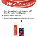 - Dip the applicator into Jaquline USA Color Me Matte liquid lipstick and smoothly glide it over your lips. Repeat for a deeper color intensity.