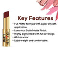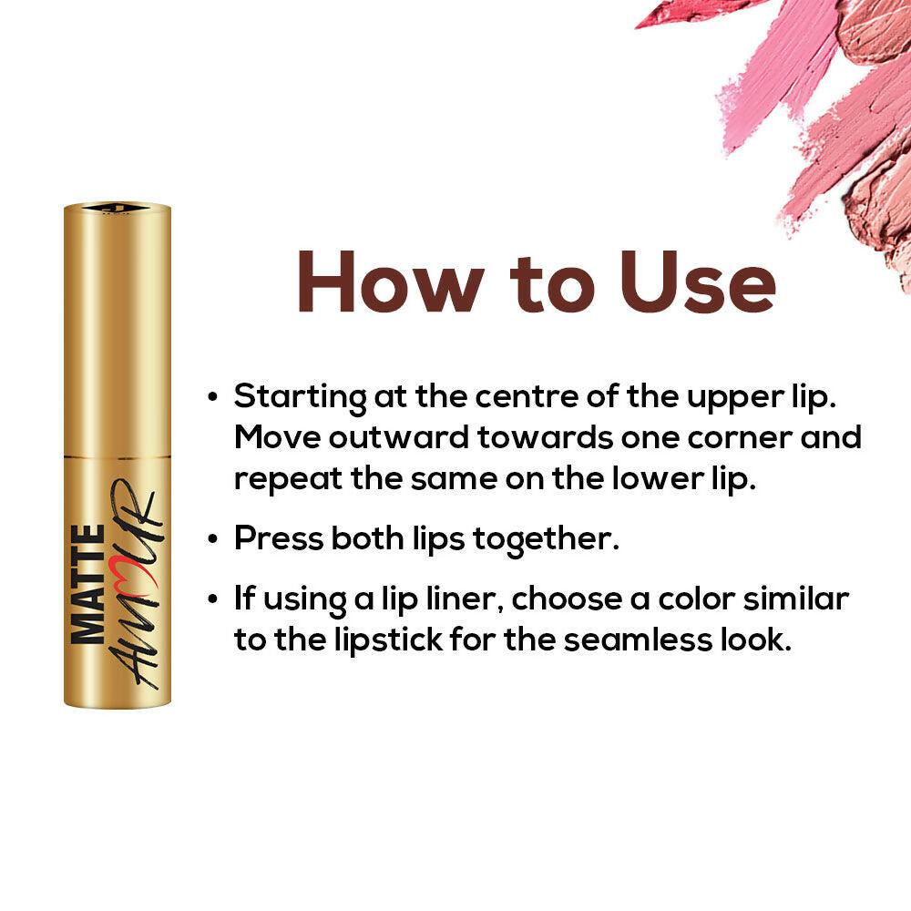 About the product:Master the art of the matte look with Jaquline USA Matte Amour Lipstick, that is a nourishing formula perfect for those who love a bold, and fiery lip look. This lipstick is enriched with natural oils i.e. Avocado oil, capsicum oil, jojoba oil and Vitamin E, so it’s time to pucker up and give your lips the love they deserve. It hugs lips in plush satin matte color that is ultra comfortable and comes in a high precision bullet that exudes luxury & packs lips with intense colour in a single swipe.