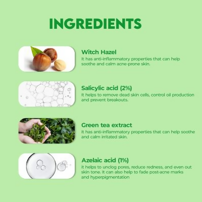 - Glycerin, Aloe Vera Extract, Witch Hazel Extract, Salicylic Acid, Green Tea Extract, Azelaic Acid, Potassium Azeloyl Diglycinate, Phenoxyethanol & Ethyl Hexyl Glycerin, Xanthan Gum, Perfume, Sodium Gluconate, Purified Water.