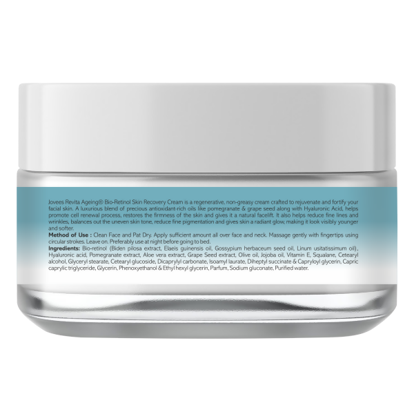 - Jovees Revita Ageing Bio-Retinol Skin Recovery Cream is a rejuvenating, non-oily cream designed to refresh and strengthen your facial skin. A lavish fusion of precious antioxidant-rich oils, including pomegranate & grape seed, combined with Hyaluronic Acid, supports the cell renewal process, enhances skin firmness, and provides a natural lift. It also aids in diminishing fine lines and wrinkles, evening out uneven skin tone, reducing minor pigmentation, and imparting a radiant glow, leaving skin looking noticeably younger and softer.