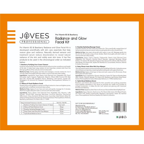 About the Product:- The Pro Vitamin B3 and Bearberry Radiance and Glow Facial Kit is meticulously crafted with essential skincare components that assist in reviving luminosity and glow. The kit's naturally derived extracts along with a treatment serum work to diminish discoloration, unveiling the skin's inherent radiance and visibly balancing the skin tone. It comprises five products that should be applied in the sequence specified below.