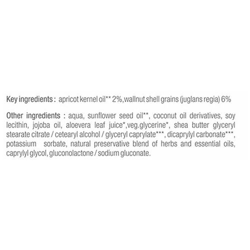Cold Pressed Apricot (Prunus Armeniaca) Kernel Oil 2%, Walnut (Juglans Regia) Shell Grains 6%, Purified Water (Aqua), Cold Pressed Sunflower (Helianthus Annuus) Seed Oil, Coconut (Cocus Nucifera) Oil Derivatives, Cold Pressed Moringa Seed (Moringa Oleifera) Oil, Cetearyl Olivate**, Vegetable Glycerine, Octyldodecanol, Cold-Pressed Jojoba (Simmondsia Chinensis) Oil, Aloe Vera* (Aloe Barbadensis) Leaf Juice*, Sorbitan Olivate**, Shea (Butyrospermum Parkii) Butter, Soy Lecithin, Caprylyl Glycol, Potassium Sorbate, Gluconolactone, Sodium Gluconate, Ethylhexylglycerin, Natural Preservative Blend Of Herbs And Essential Oils.