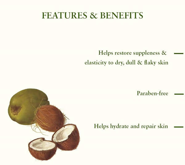 Coconut: Combats dryness and dullness; Enhances healthy blood circulation; Provides nourishment and hydration to the skin