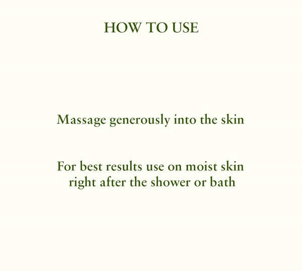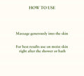 Generously massage into the skin. For optimal results, apply on damp skin immediately after showering or bathing.