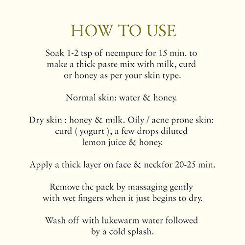 Soak 1-2 tsp of Neempure for 15 minutes to create a thick paste (as instructed) and set aside. Cleanse the face with cotton wool dipped in raw milk. Apply a generous layer on the face and neck for 25-30 minutes. Rinse off with lukewarm water while gently massaging with wet fingertips followed by a cool splash. Pat dry and apply JH Cascade Day Care lotion to moisturize. In the case of active Pimples/Acne, use Neempure alternately with JH pimple treatment pack twice daily.