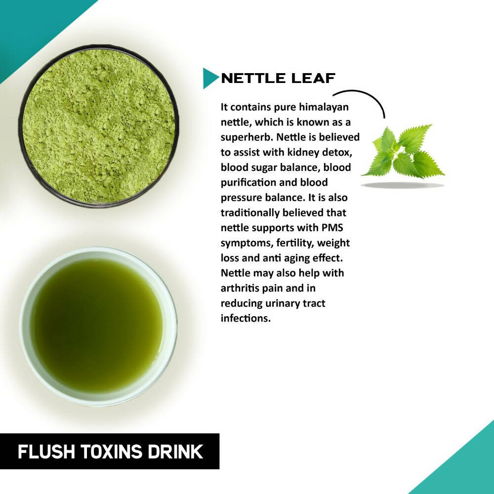 About the Product:- Enjoy Justvedic Flush Toxins Drink Mix in its purest form - a perfect balance of taste, health, and aroma. Justvedic Flush Toxins Drink Mix consists of pure nettle leaves harvested from Uttarakhand, India - which has been machine grounded to maintain maximum effectiveness and freshness.