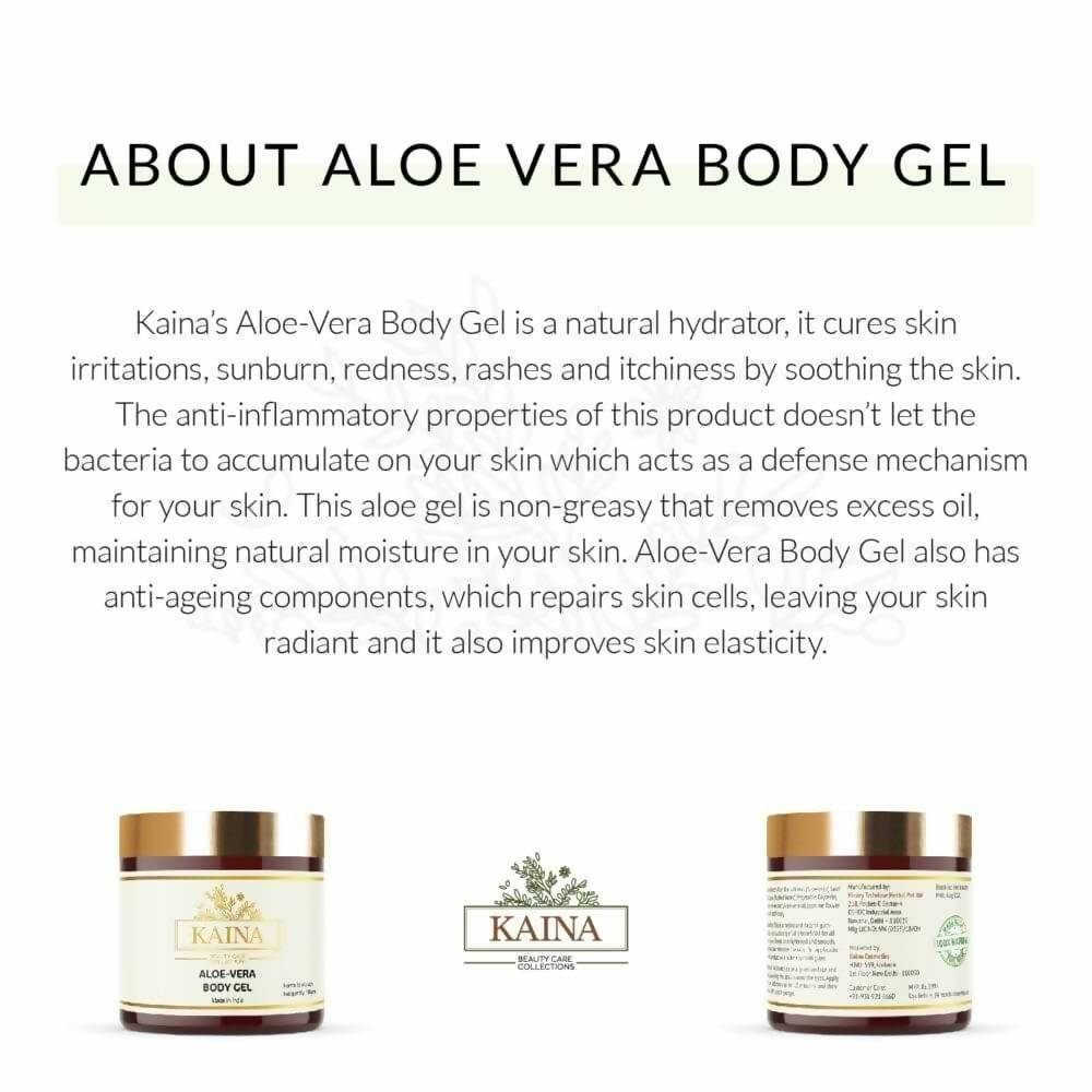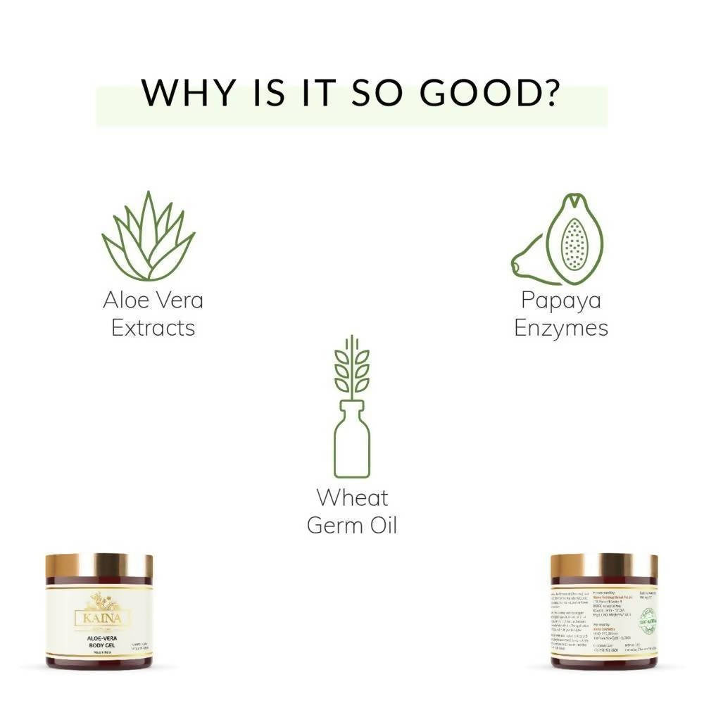 Kaina’s Aloe-Vera Body Gel serves as a natural moisturizer, alleviating skin irritations such as sunburns, redness, rashes, and itchiness by soothing the skin. This product’s anti-inflammatory characteristics prevent bacterial buildup on your skin, acting as a protective barrier. The aloe gel is non-greasy and efficiently removes excess oil while keeping your skin's natural moisture intact. Additionally, the Aloe-Vera Body Gel contains anti-aging elements that repair skin cells, leaving your skin luminous and enhancing its elasticity.