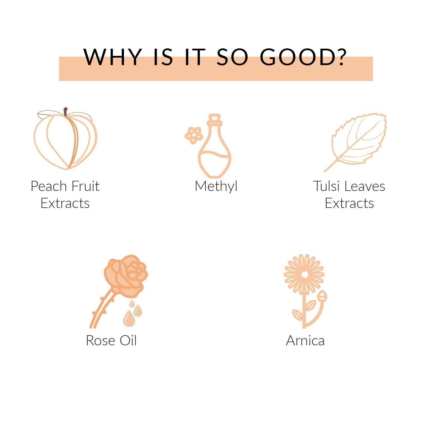 Neem Oil, Tulsi Leaves Extracts, Rose Oil, Arnica, Methyl, Peach Oil, and Peach Fruit Extract.