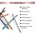 About the product:- The Kay Beauty Gel Eye Pencil collection blends the sleek finish of a gel with the precision of a pencil for seamless application. These waterproof pencils glide on with a luscious creaminess and offer vibrant color that lasts for 24 hours without smudging or fading, unless removed with a makeup remover. With high pigmentation, the range includes 7 opulent jewel tones specifically curated to complement all Indian complexions, giving your eyes a standout appeal in just one stroke. Let your eyes make a statement.