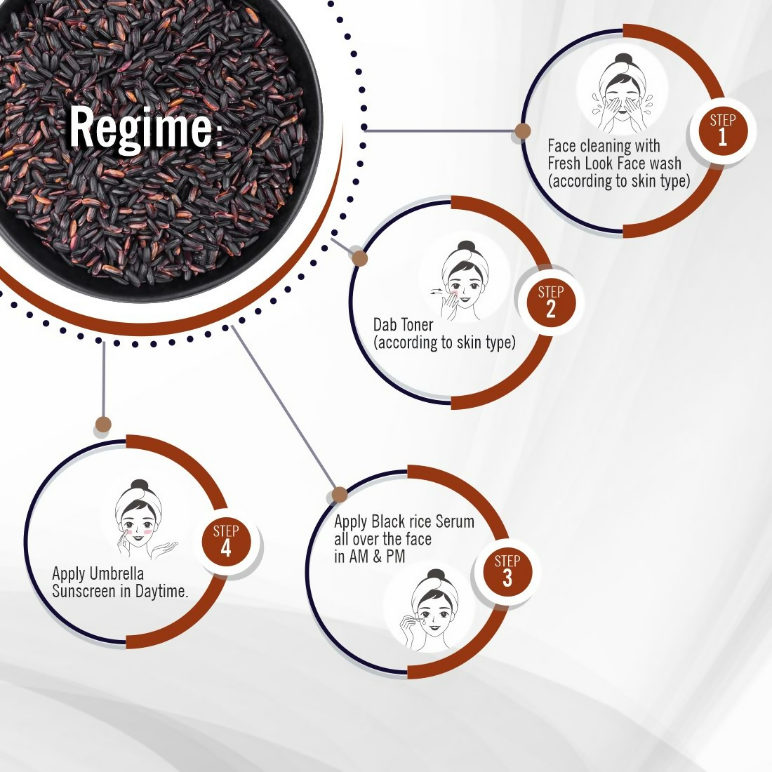 - Cleanse with Fresh Look Face wash tailored to your skin type. Follow with a hydrating toner. Gently spread Black Rice Serum across the face both morning and night. During the day, apply Umbrella Sunscreen.