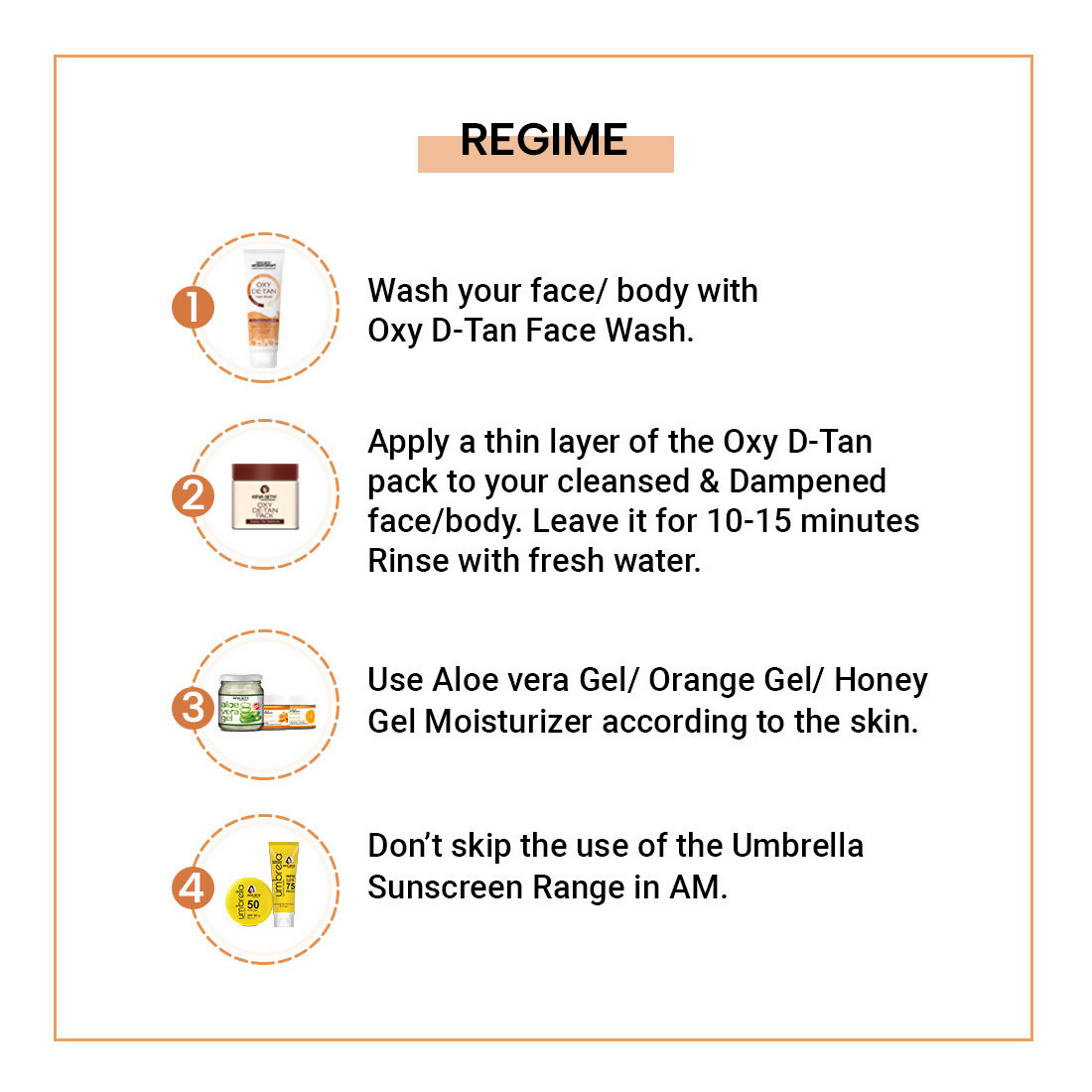 - For a complete tan-free skincare routine, cleanse the face with Oxy D Tan Clay Face wash. Apply a thin & even layer of the Oxy De-Tan Pack to the cleansed & moistened face & neck. Leave it on for 10-15 minutes. Emulsify using circular motions. Rinse with fresh water. Use once a week. Follow up with Aloe Vera Gel Moisturizer, Orange Gel Moisturizer, or Honey Gel Moisturizer according to your Skin Type. Don’t forget to apply the Umbrella Sunscreen Range in the morning.