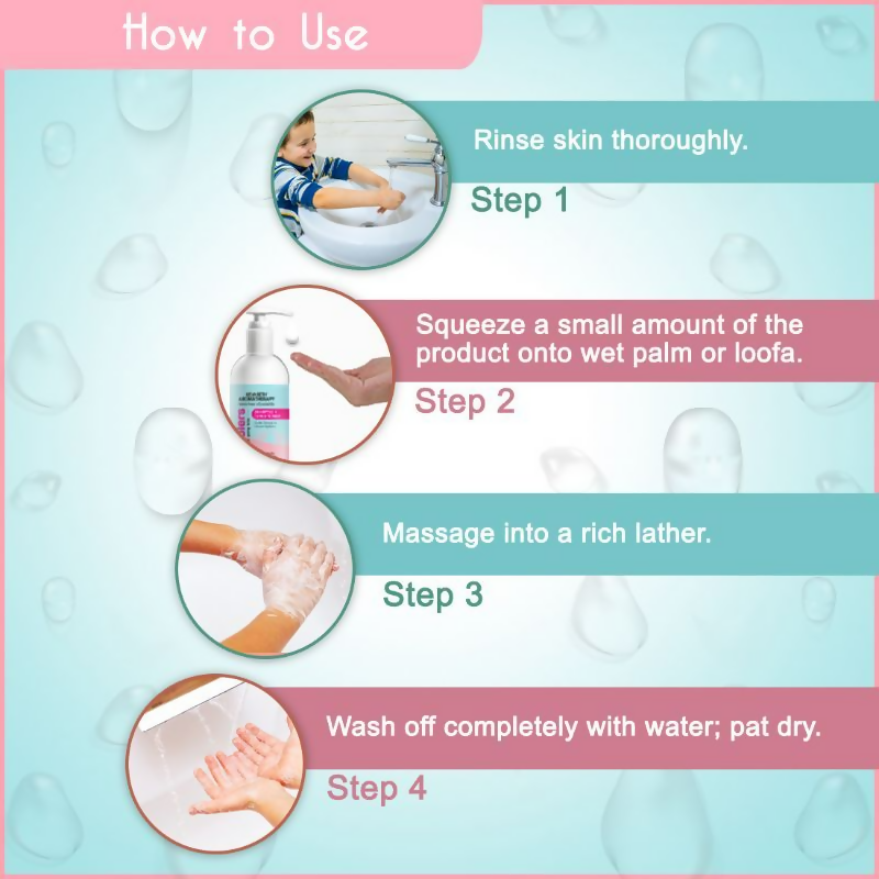 - Thoroughly wet the skin; dispense a small amount onto wet hands or a loofah and work into a rich lather; rinse off completely with water and gently pat dry.