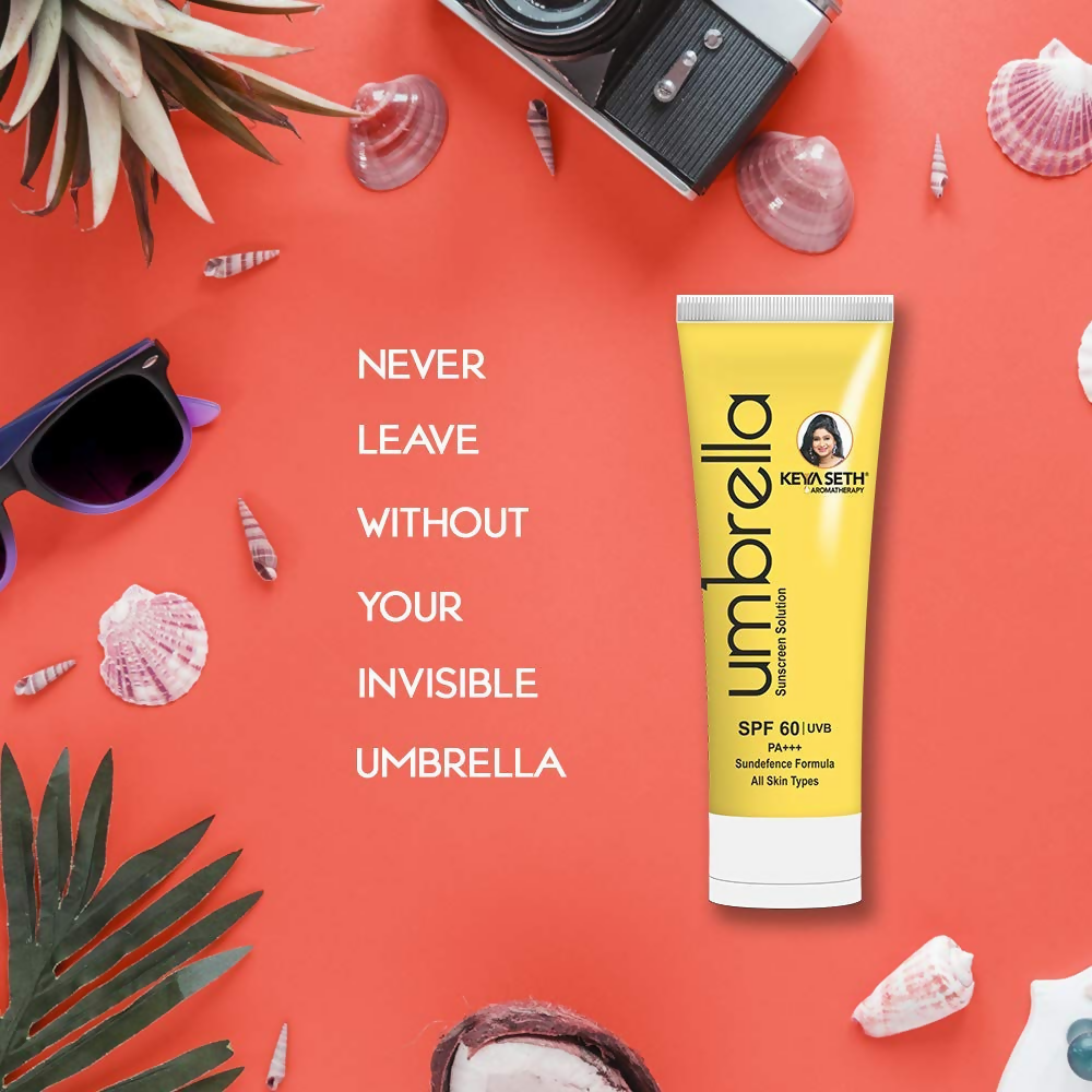 About the Product:- The Keya Seth Aromatherapy Umbrella Sunscreen Solution with SPF 60 and PA+++ offers comprehensive, sweat-resistant protection against the sun's rays. This urban-specific formula effectively diminishes Persistent Pigment Darkening (PPD) caused by UV exposure, while its natural components ensure your skin remains healthy and well-nourished.