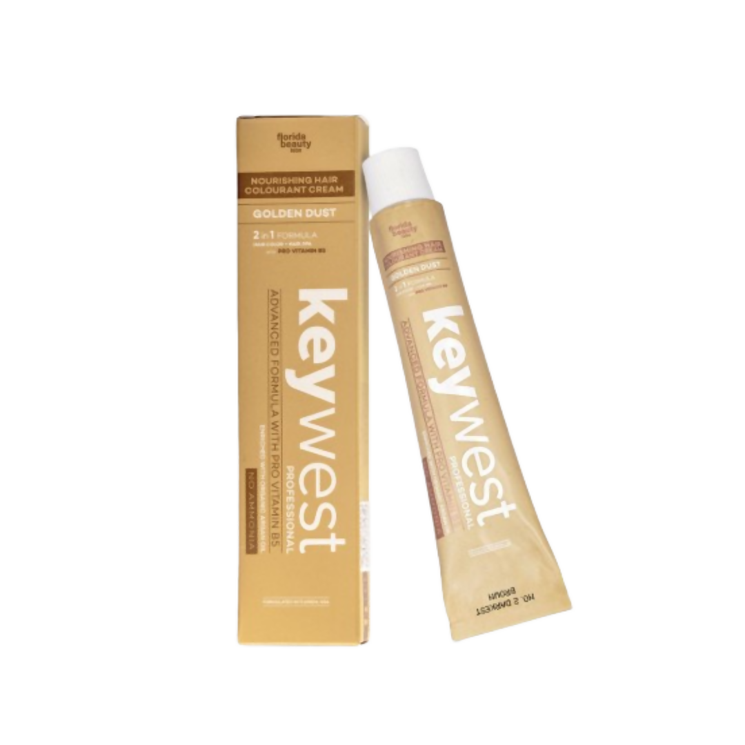 - Keywest Professional Golden Dust Hair Colourant Cream delivers a dual-purpose blend – offering both hair color and a spa-like treatment. Crafted without ammonia, this hair color is tailored for professional application. It thoroughly saturates each hair strand from root to tip, ensuring impeccable grey coverage. The advanced conditioning formula preserves the pH equilibrium, resulting in hair that is silky and remarkably soft while providing comprehensive protection. Infused with Pro Vitamin B5 and enriched with organic Argan oil, this ammonia-free hair color promises a luxurious transformation akin to a spa experience.