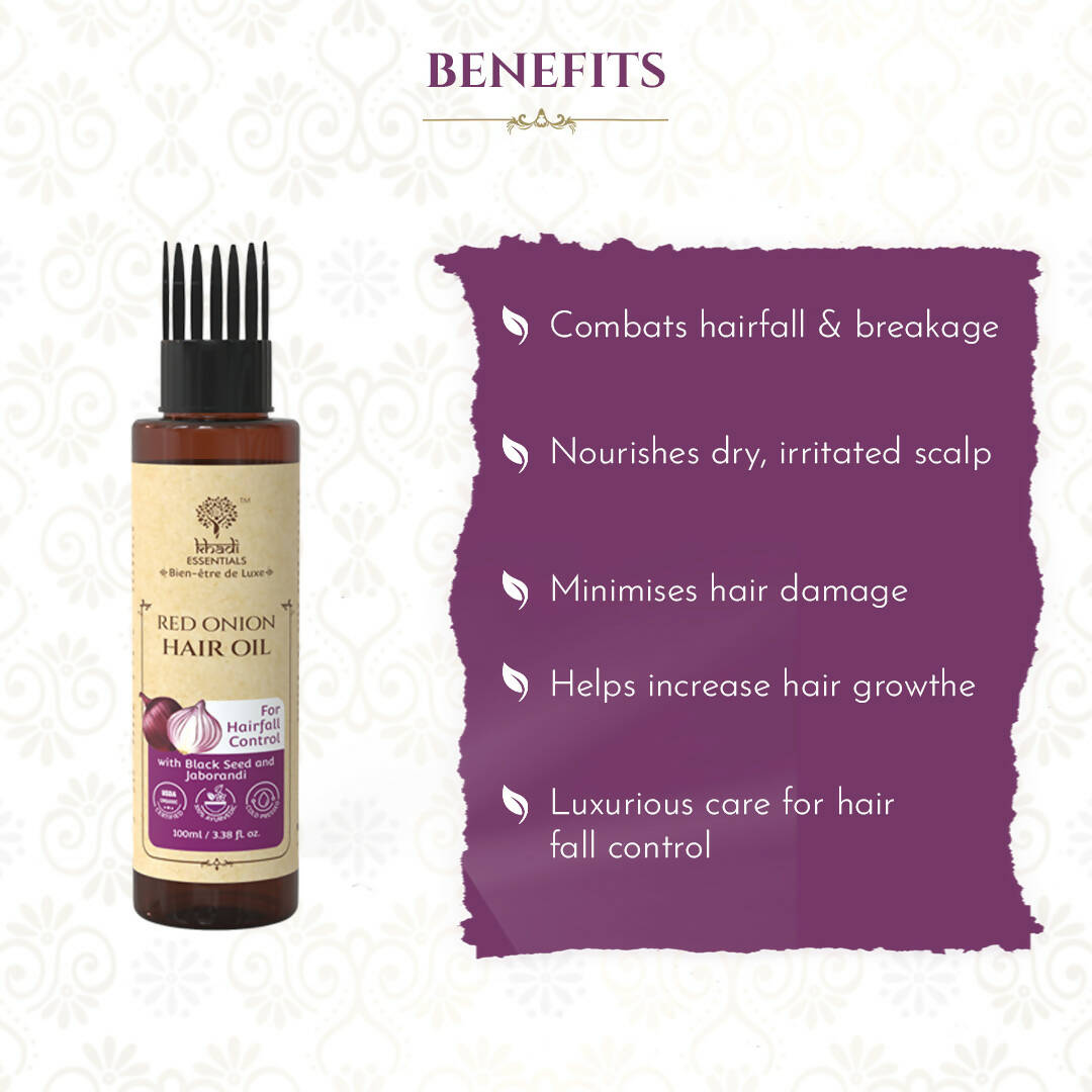 Khadi Essentials Red Onion Hair Oil is an exceptional ayurvedic blend featuring 11 powerful herbs designed to combat hair fall and promote the growth of hair follicles. This hair growth oil penetrates deeply into the roots, boosting circulation and encouraging dormant follicles to flourish healthily and robustly from root to tip.Enriched with vitamin E, Jaborandi, and sunflower oil, this hair oil for hair fall and regeneration offers profound nourishment to the scalp, reducing flakiness and dandruff, thereby imparting extra shine and strength to your hair. The inclusion of Almond, Jojoba, Olive, and Coconut Oils further strengthens this potent hair growth formula.