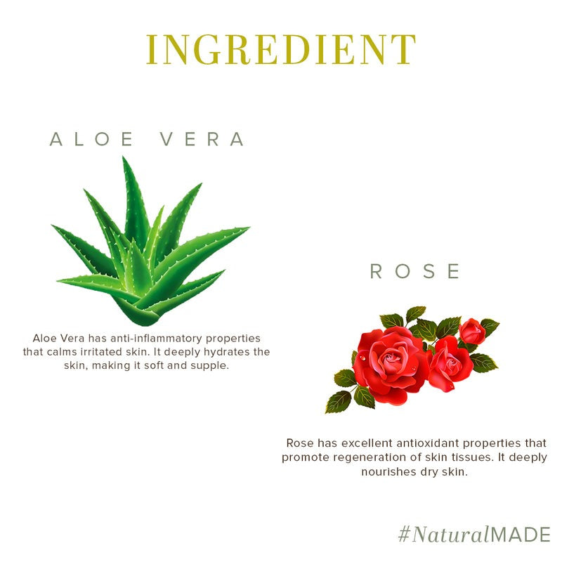 Purified Water, Aloe Vera Ext. Rose Water Ext. Wheatgerm Oil, Teatree Oil Base Q.S.