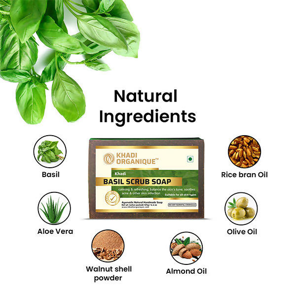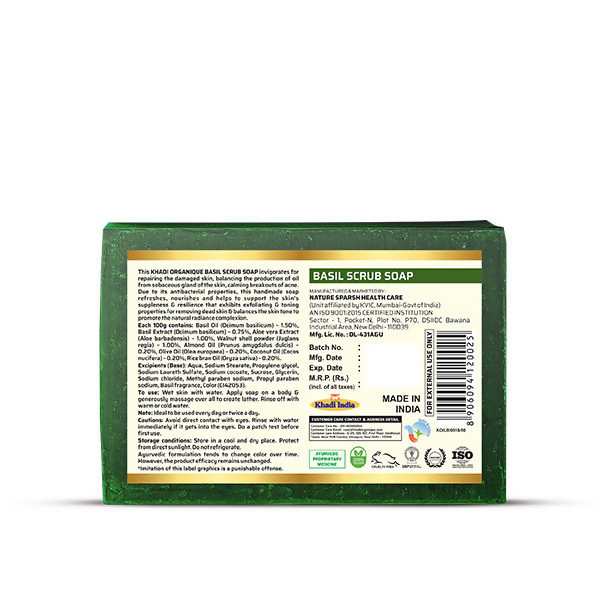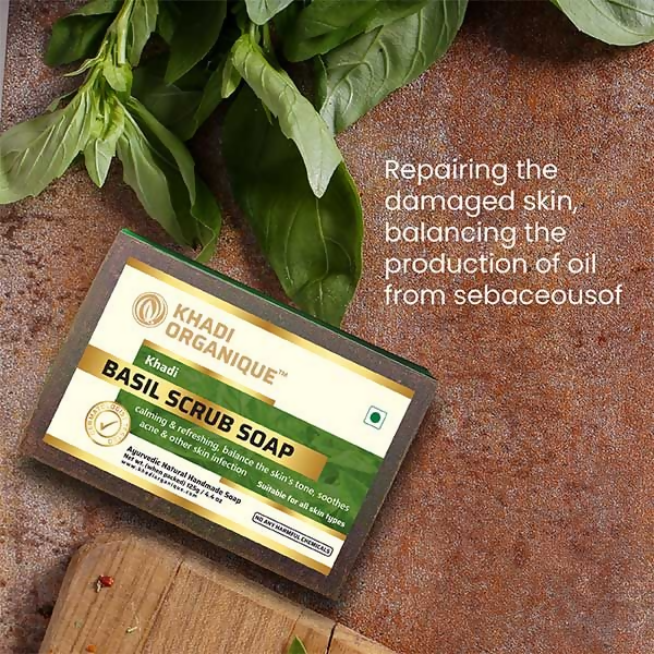 This Khadi Organique Basil Scrub Soap revitalizes by repairing damaged skin, regulating the oil secretion from the skin's sebaceous glands, and soothing acne outbreaks. Thanks to its antibacterial qualities, this artisanal soap refreshes, nourishes, and aids in maintaining the skin's elasticity and strength, featuring exfoliating and toning benefits to eliminate dead skin and even out the skin tone, enhancing a naturally radiant complexion.