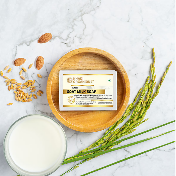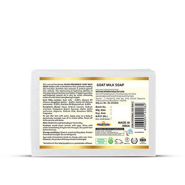 This artisanal Khadi Organique Goat Milk Soap, enriched with multiple vitamins, promotes radiant skin; it supports skin rejuvenation and guards against environmental damage. The soap's moisturizing and hydrating properties leave the skin looking luminous and smooth.