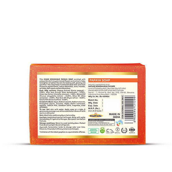 The Khadi Organique Papaya Soap, infused with papain extracts, is designed to brighten and firm your skin, leaving it soft, radiant, and youthful. This soap assists in removing dead skin cells and diminishes hyperpigmentation, blemishes, acne, wrinkles, and dark spots.