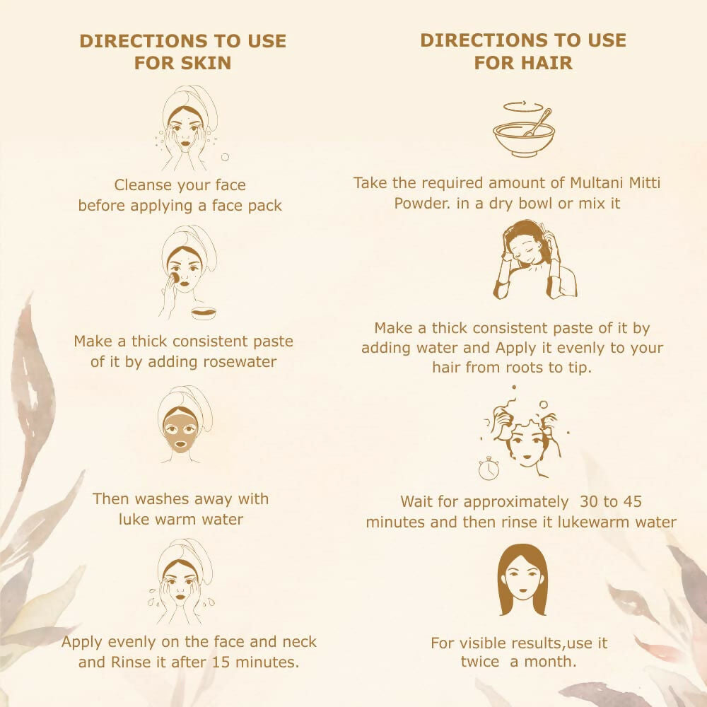 - MULTIPURPOSE ORGANIC MULTANI MITTI – This organic multani mitti powder for the face aids both men and women in refining their skin texture by eliminating dead skin cells, purifying pores, and revitalizing appearance. This natural skin cleanser, face mask, and toner is also advantageous for hair. When used as a hair pack and wash, Multani Mitti leaves the scalp clean with soft, silky, and radiant hair.