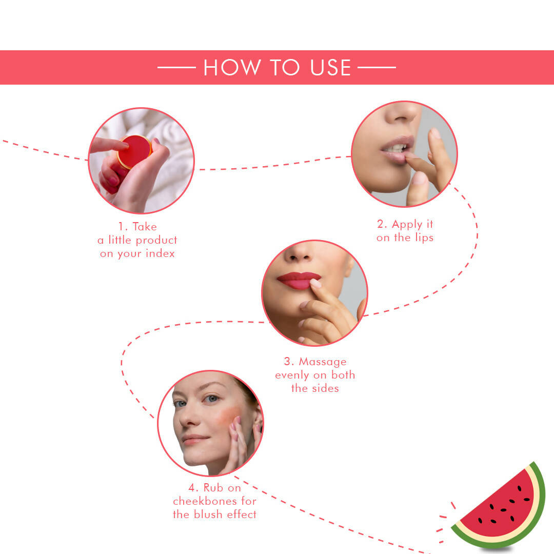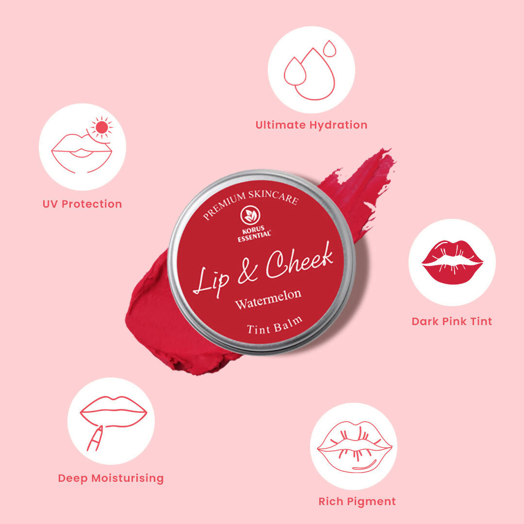 About the Product:Korus Essential Watermelon lip and cheek balm is the perfect remedy for dry and undernourished lips. Infused with shea butter, it serves as a soothing agent, ensuring your lips remain moisturized even in harsh weather conditions, while a subtle hint of watermelon lingers after application. Crafted with an ideal blend of Candelilla wax to seal in moisture and Carnauba wax for a lustrous finish, along with castor oil, it imparts a deep pink hue to your lips, making them appear soft, full, and alluring. Additionally, it can be applied to your cheeks for a natural blush look.