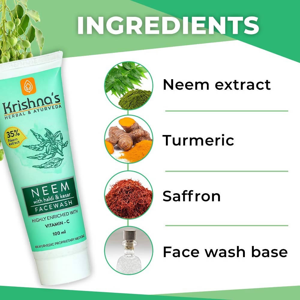 - Krishna's Neem Face Wash is an herbal concoction infused with the richness of neem to diminish acne, pimples, and other skin challenges. A natural fusion of Neem, Turmeric, and Saffron works in harmony to balance oil production, soothe cracked skin, hydrate it from within, and restore the skin's natural flexibility, making it soft and supple.