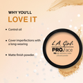 Achieve a perfect complexion with L.A. Girl HD PRO Face Pressed Powder, designed to mask imperfections with its enduring, oil-absorbing formula.
