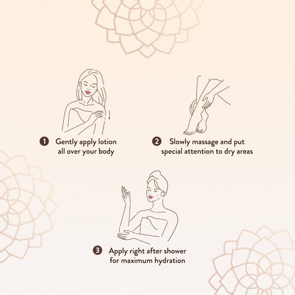 - Gently apply lotion all over your body, giving special attention to dry areas, and massage slowly.