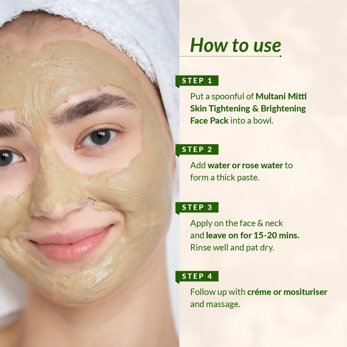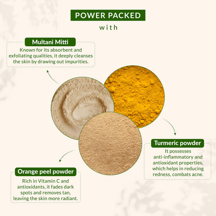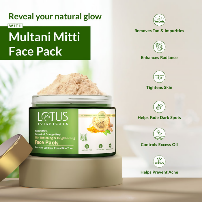 - Discover the revitalizing essence of nature with the Lotus Botanicals Multani Mitti, Turmeric & Orange Peel Skin Tightening & Brightening Face Pack. Formulated with a powerful blend of natural elements, this face pack delivers a sumptuous spa-like experience right in the comfort of your home. Enriched with the benefits of Multani Mitti powder, Turmeric powder, and Orange peel powder, this face pack is specifically crafted to firm, illuminate, and rejuvenate your skin, leaving it feeling invigorated and glowing. Ideal for various occasions, be it a celebration, wedding, a day at work, or a soothing weekend, it serves as your perfect remedy for removing tan and unveiling your skin's natural radiance.