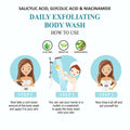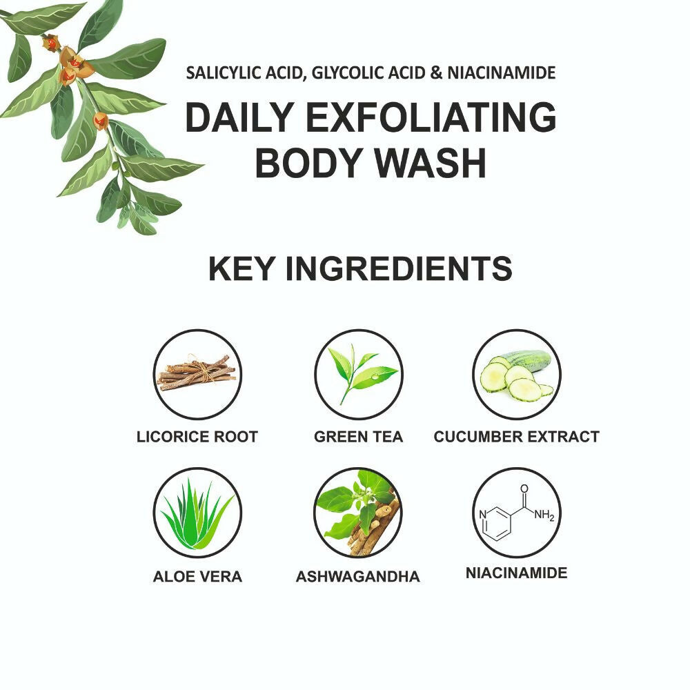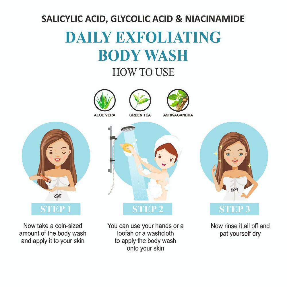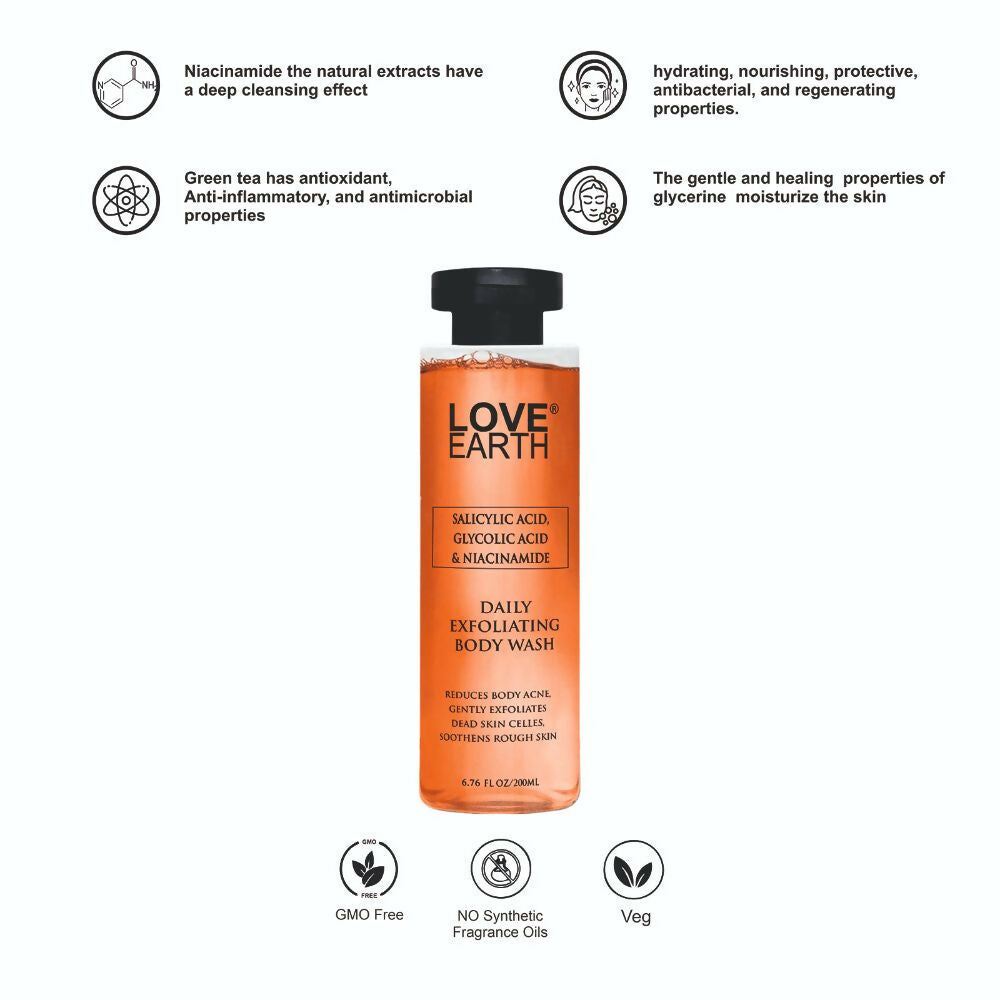 - Love Earth Daily Exfoliating Body Wash is designed to diminish body acne, gently remove dead skin cells, and soothe rough skin with its blend of Salicylic Acid, Glycolic Acid & Niacinamide.