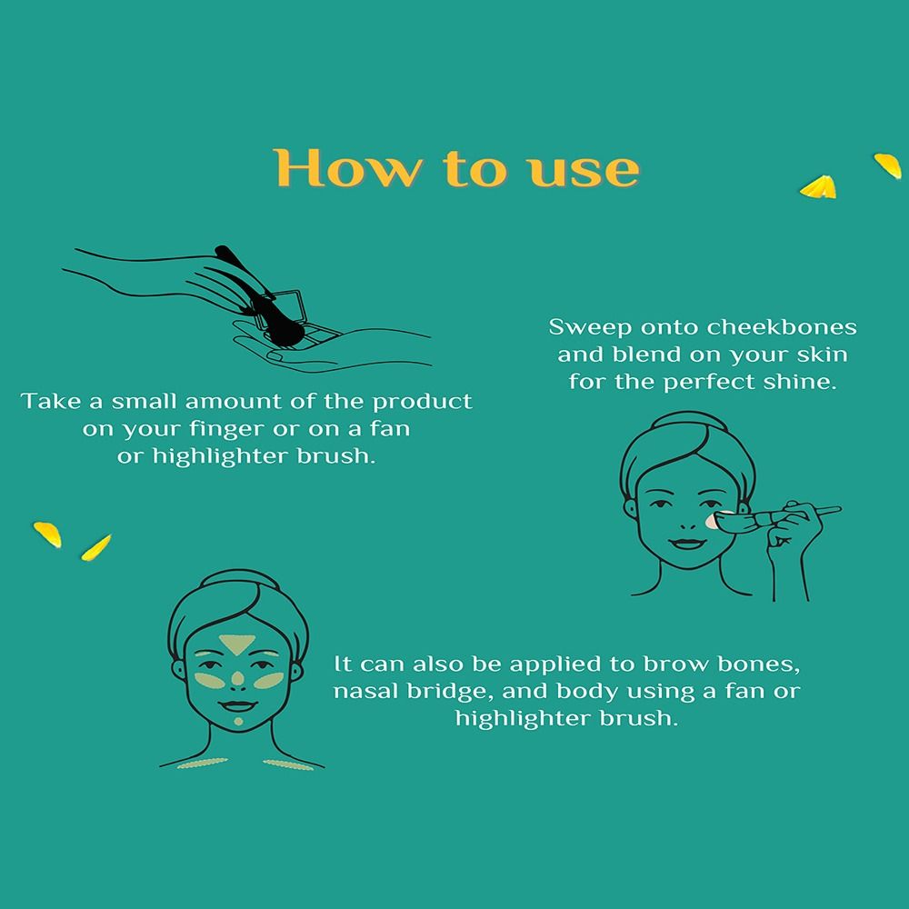 - Apply to cheekbones, brow bones, nasal bridge, and body using a fan or highlighter brush for a radiant glow.