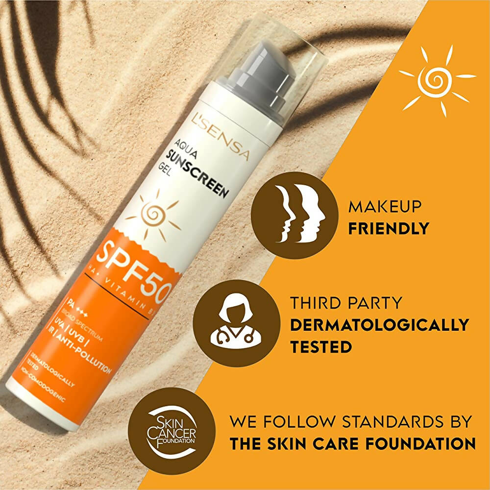 - L'SENSA SPF 50 Aqua Sunscreen Gel offers a distinctive formulation that shields your skin against UVA, UVB, IR, Blue Light, and Pollution.