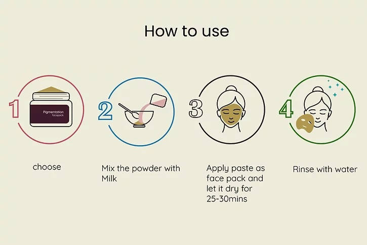 Cleanse and gently dry your face. Take an adequate amount of the pack, blend thoroughly with milk, and apply an even coat. Let it sit for 25-30 minutes and then softly wash off with water. For optimal results, incorporate into your daily routine.