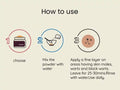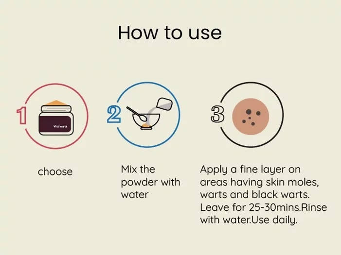 - Take a suitable amount of the powder, mix thoroughly with water, and apply a thin layer on areas with skin moles, warts, and black warts.