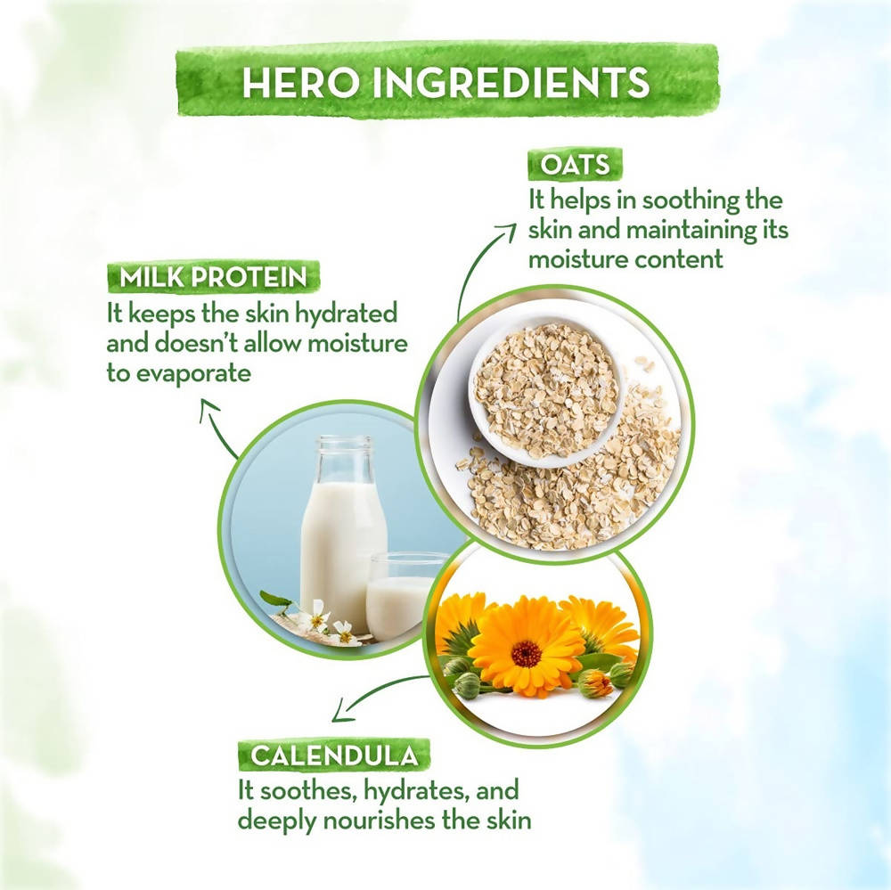 - Infused with natural ingredients like Oats, Milk, and Calendula, my lather is luxuriously creamy, allowing your baby to revel in a bath full of nourishing and refreshing goodness. Oats offer anti-inflammatory benefits that calm your baby's skin, while Milk ensures it stays soft and hydrated. Calendula, enriched with Vitamin E and Amino Acids, provides deep nourishment to the skin.
