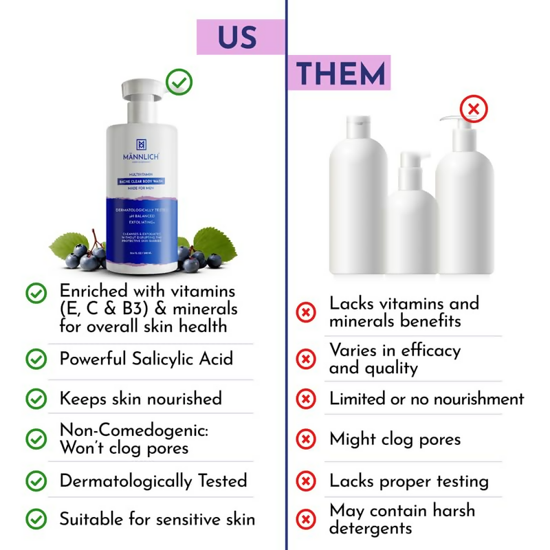 - Men's Body Acne Wash Shower Gel: Mannlich Multivitamin Bacne Clear Body Wash employs a powerful formulation with 2% Salicylic Acid to thoroughly purify pores, eliminate dead skin cells, and efficiently diminish and avert body acne.