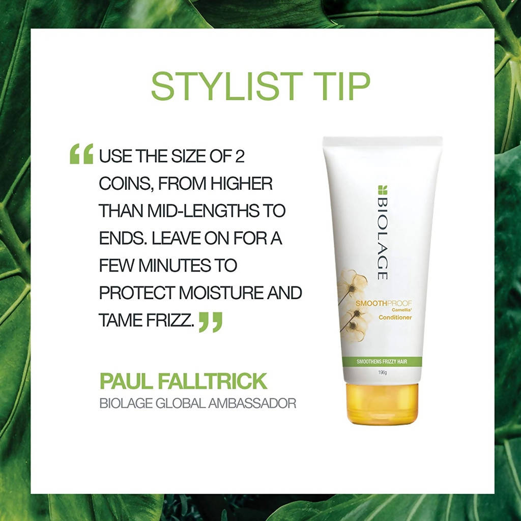 Effortlessly manage unruly, frizzy hair! Frizzy tresses can be challenging to control in humid climates. Drawing inspiration from the naturally water-resistant camellia, the Matrix Biolage Smoothproof Conditioner banishes frizz and unwanted volume with cutting-edge formulas inspired by nature. Utilizing Biomatch technology, which replicates the water-repellent features of the Camellia Flower, this conditioner ensures humidity control and anti-frizz smoothness even in 97% humidity.