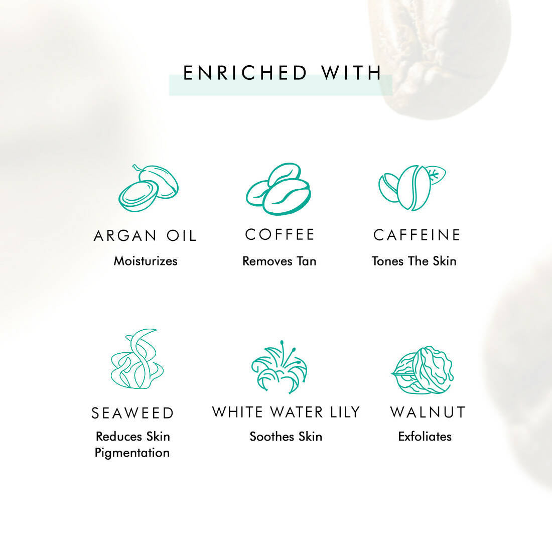 - Pure Arabica coffee and walnut effectively exfoliate. Coffee stimulates collagen production for youthful skin and helps reduce cellulite. The caffeine in coffee is a rich antioxidant source that evens skin tone and diminishes puffiness. Hibiscus rejuvenates skin cells to lessen fine lines and premature aging signs. A touch of caramel awakens your senses, giving your skin a flawless radiance. Argan Oil and Vitamin E hydrate and nourish your skin, leaving it supple and ready for a gentle touch!