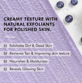 - Buff away dead skin cells and tan with this invigorating body scrub, infused with fresh, ripe blueberries brimming with a delightful fruity fragrance! Enriched with vitamin C and antioxidants, Blueberry Extracts enhance skin vitality and impart a radiant glow. The antioxidant properties of Coffee help eliminate tan and refine skin texture. Apricot gently exfoliates the skin, effectively removing dirt, grime, and dead skin cells, leaving the skin clear, smooth, and hydrated. Shea Butter provides essential moisture, nourishment, and softness to the skin. The scrub's creamy texture ensures it glides effortlessly, transforming your shower into a luxurious and indulgent experience.